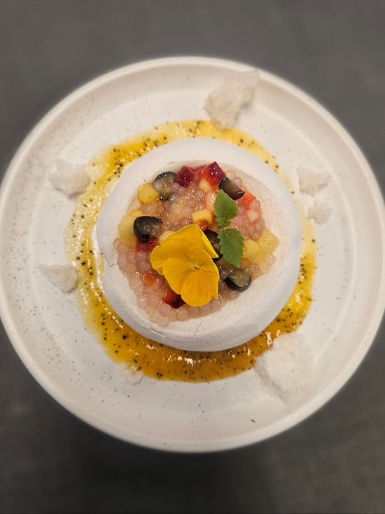 White chocolate Crème brulee, berries, pistachio & cranberry biscotti