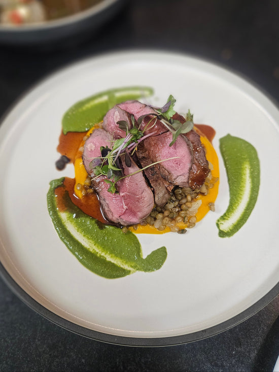 East Gippsland grass fed beef tenderloin, potato fondant, baby vegetables; Morello cherry & mustard marmalade, port wine jus